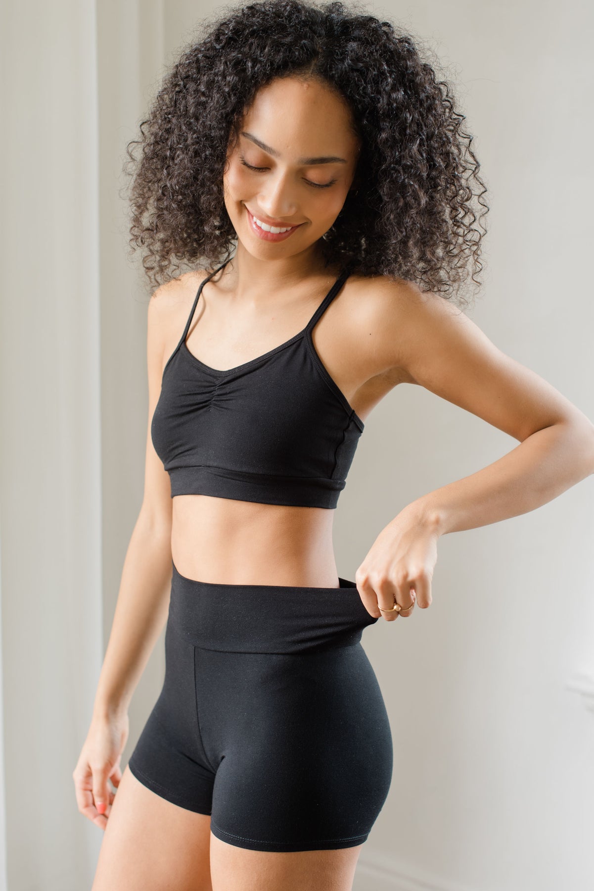 The perfect short to match all your bralettes! This super comfortable short can be worn under skirts, pants or on it's own. A wide, elastic free waistband keeps you comfortable and provides ease of movement for all kinds of sports, dance, cheer or just lounging around! Designed to match our Berry Bralette bra.