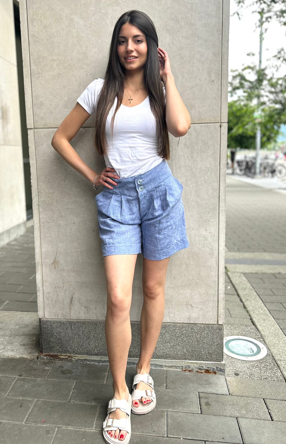This beautiful linen/cotton walking short is a perfect length for comfort and style. Breathable and soft, it looks like denim but feels like the softest linen you can find. Features a wide waistband, inverted pleats, pockets and a perfect length for even the most discerning shoppers of shorts!